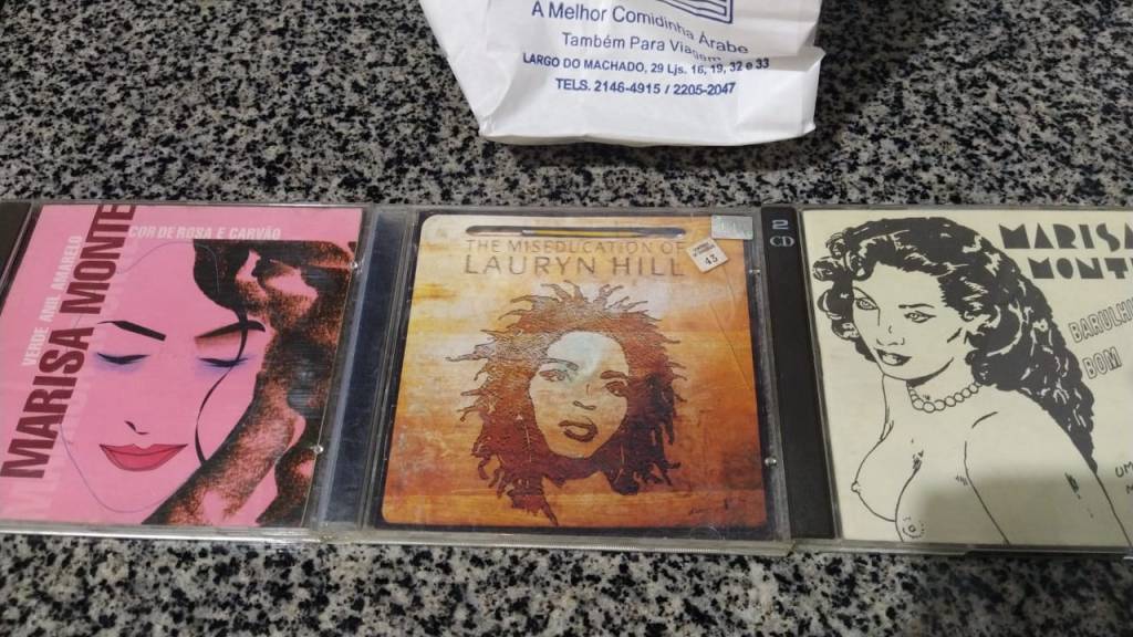 Quando estávamos prestes a nos despedir, eu percebi que a feira de livros/CDs/DVDs do Largo do Machado estava de pé ainda. Pedi um tempo pros meus amigos e fui procurar alguma coisa. Havia sonhado que comprava algo numa feira parecida, então senti que precisava estar lá. Não achei nenhum DVD ou livro bons, mas uma garota estava procurando CDs do meu lado, então eu quis procurar CDs com ela, também. Não nos conhecíamos, mas após um tempo, ela chegou em mim e disse “esse aqui é bom demais! só não compro porque já tenho!” enquanto me mostrava o CD da Lauryn Hill que ela achou. Eu fiquei extremamente bobo, até porque eu adoro Lauryn Hill e não tinha visto aquele CD ali, mas percebi que ela também estava um pouco boba falando comigo, o que me fez me sentir mais confortável. Ela me ofereceu o CD e conversamos um pouco. Eu peguei dois CDs da Marisa Monte, havia uma promoção de 3 CDs por 5 reais. Obrigado, garota da Lauryn Hill. Você me deu um ótimo achado, e certamente iluminou brevemente meu dia. Em anexo, foto dos achados + uma sacola com duas esfihas de queijo do Árabe que ficaram de penetra na foto. Ótimo dia.